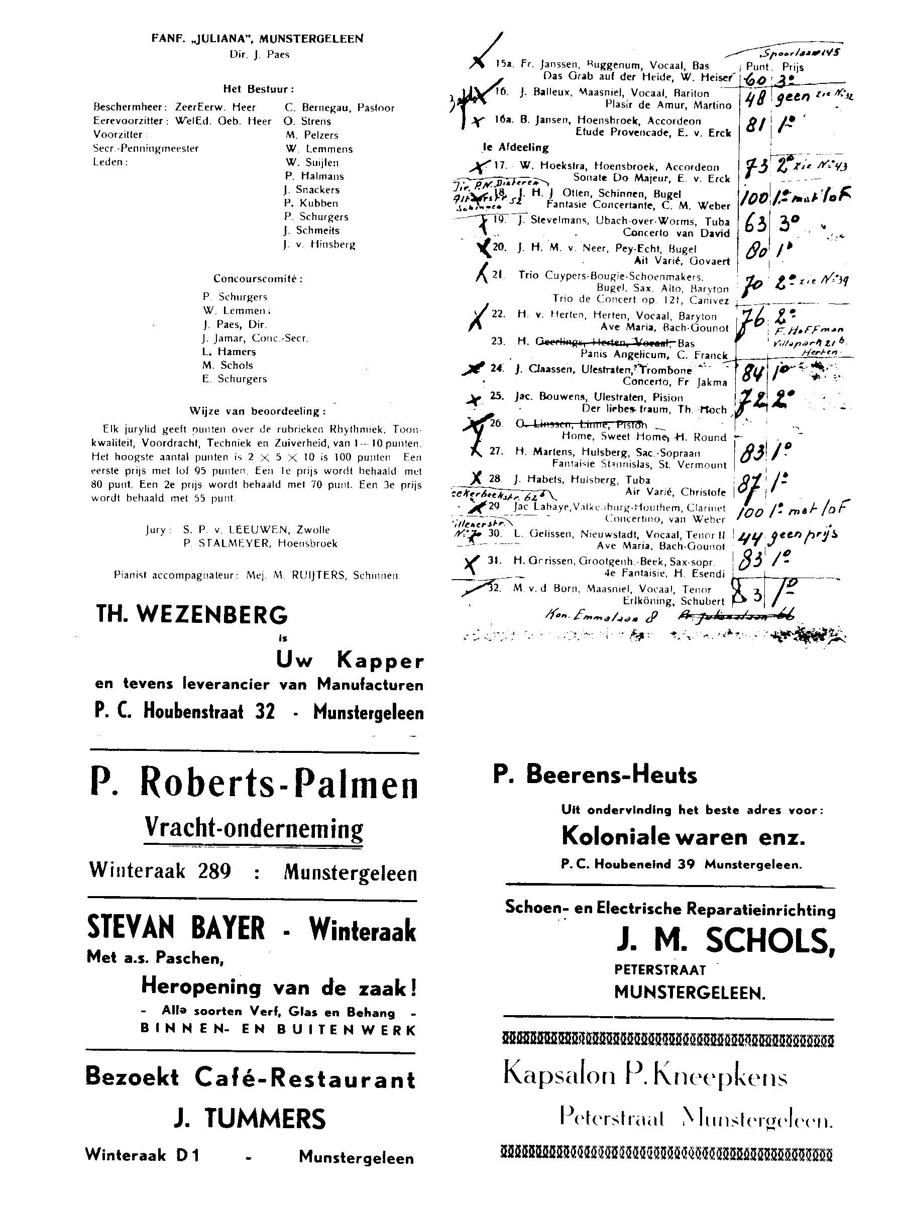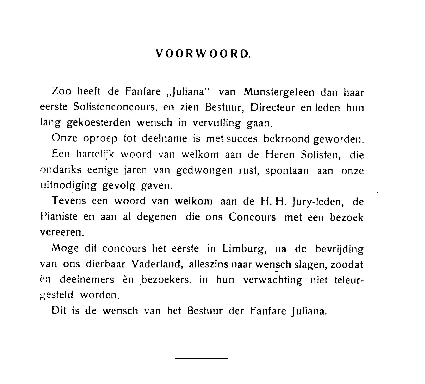 Dat het bestuur niet had stilgezeten tijdens de oorlog bewezen zij tevens door op 6 en 13 januari 1946 het eerste solistenconcours in Limburg, na de bevrijding, te organiseren. Er namen 107 solisten aan deel. Uit alle delen van Limburg kwamen zij naar Munstergeleen. Het concours werd gehouden in de gymzaal van de school. De belangstelling was echter zo groot dat men voor de tweede dag moest uitwijken naar een grotere zaal bij de Paters in Leyenbroek. Op onderstaande links staan twee willekeurige afdrukken uit het programmaboekje van destijds.
